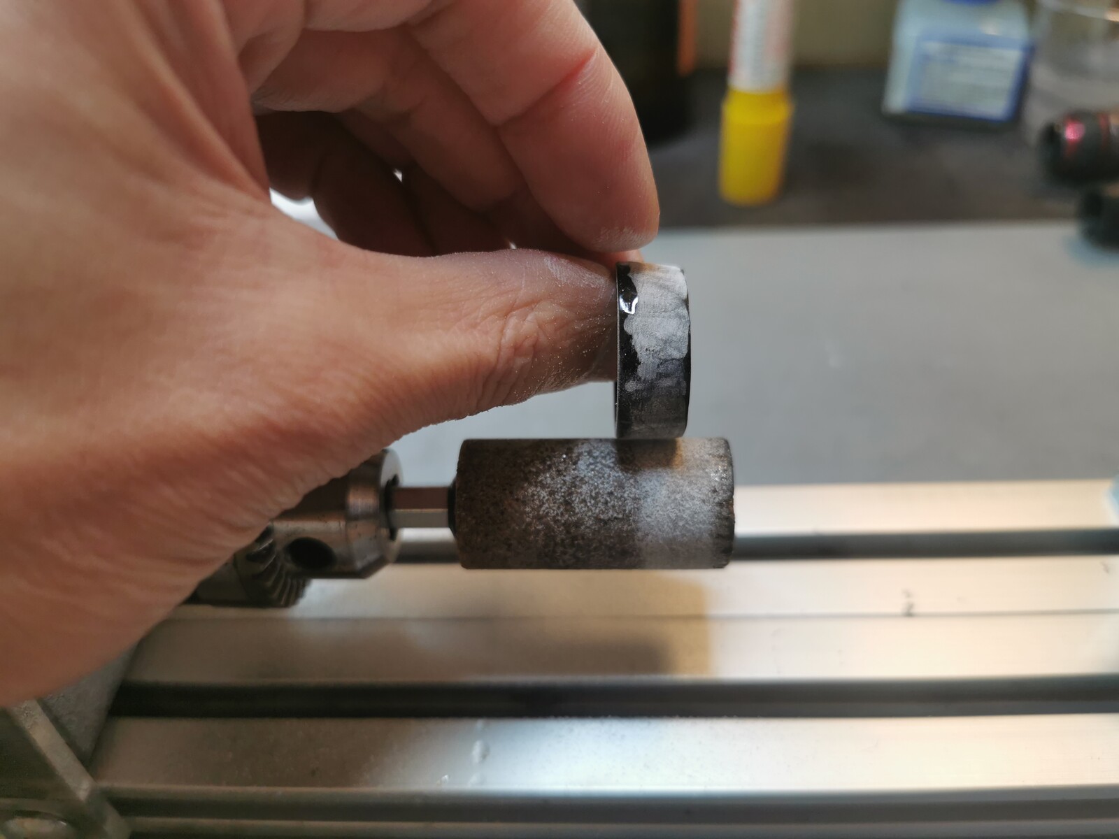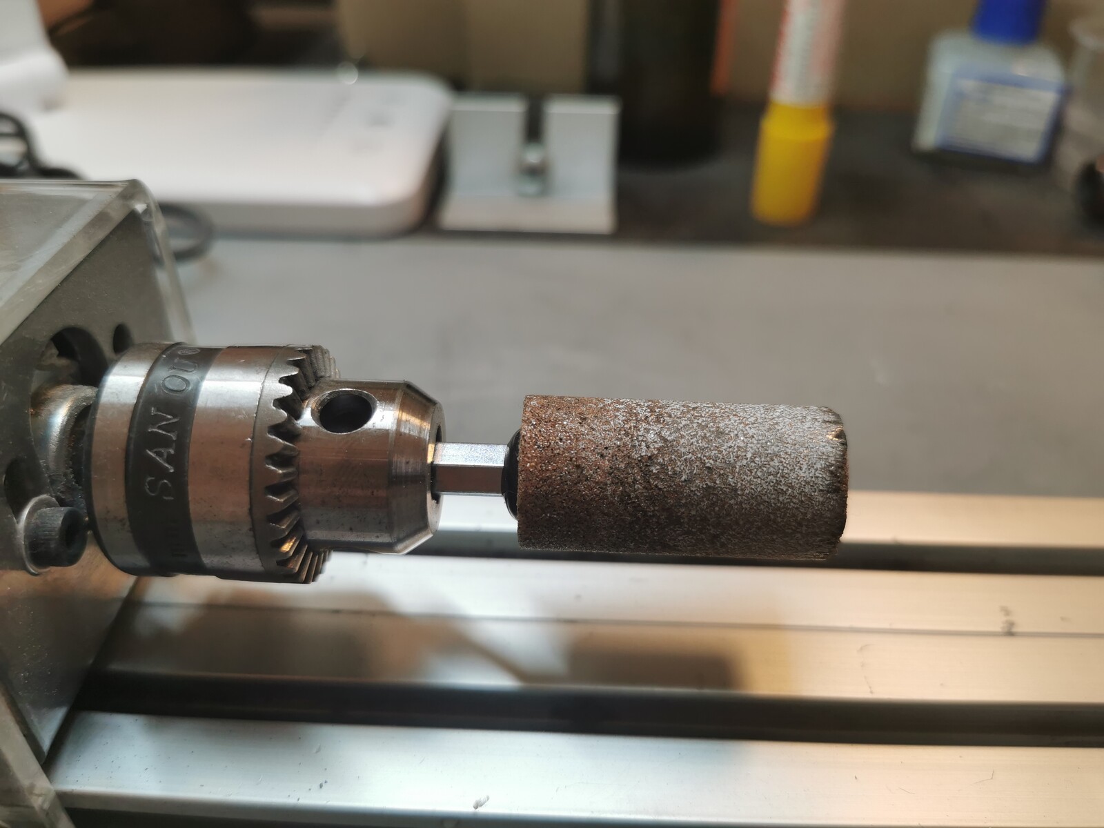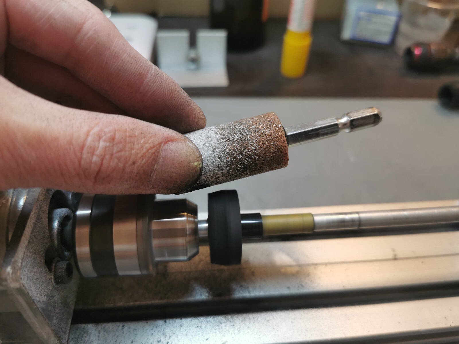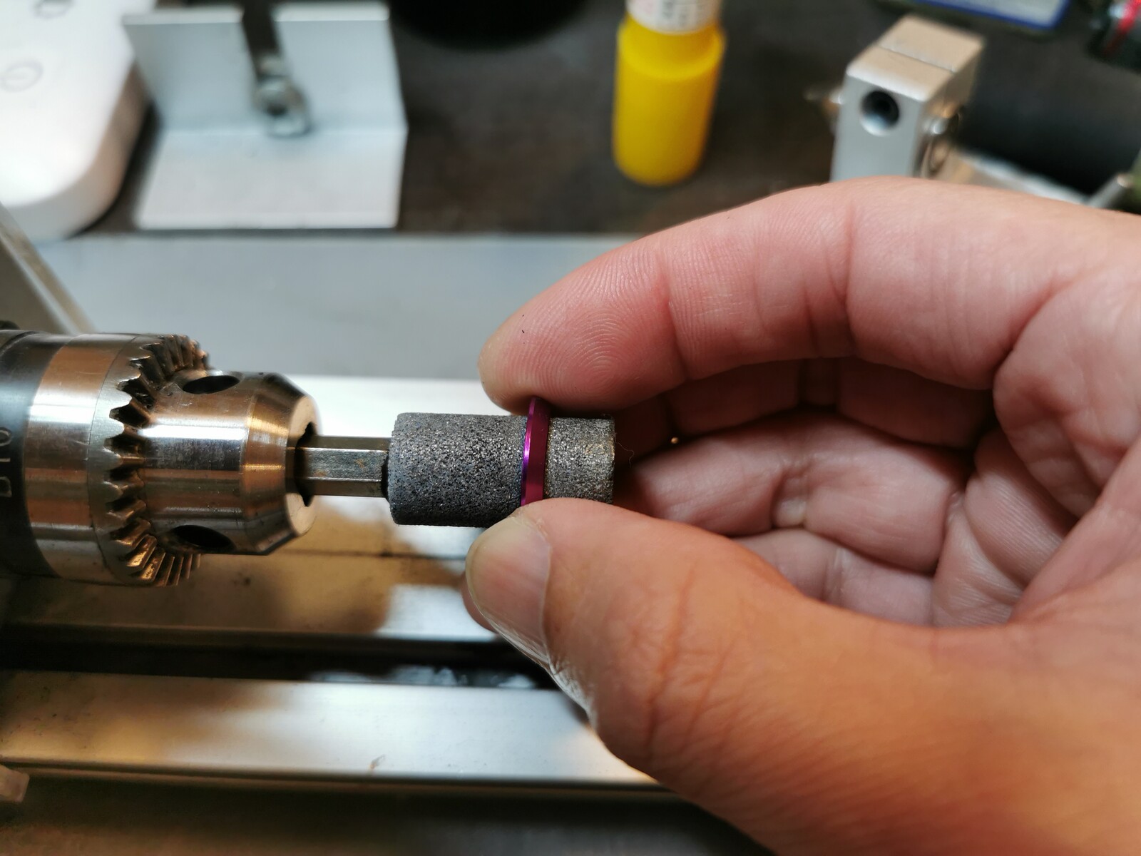 アーバーの外径調整のための研磨は、M6サイズのネジとボルトを使用して、削りたい対象物をボルトで挟んで固定。