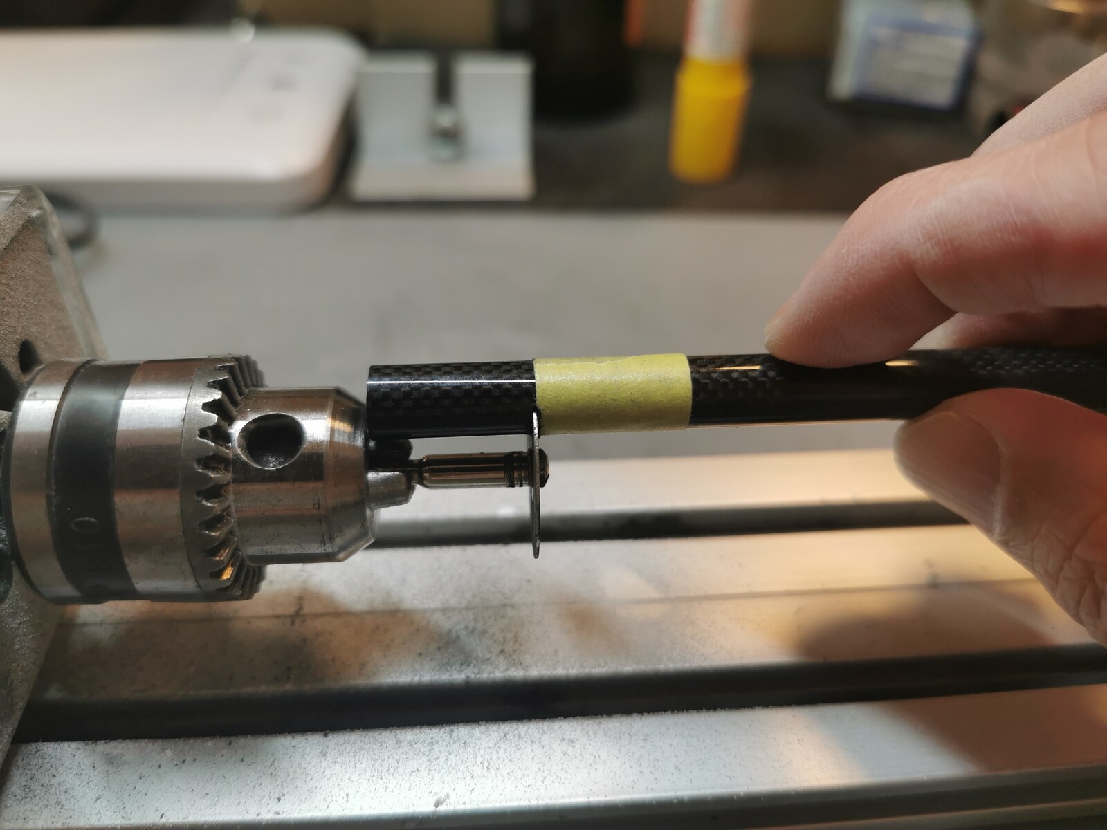 最後はフレキシブルシャフト。旋盤にセットしたら、チタンテイップを装着。