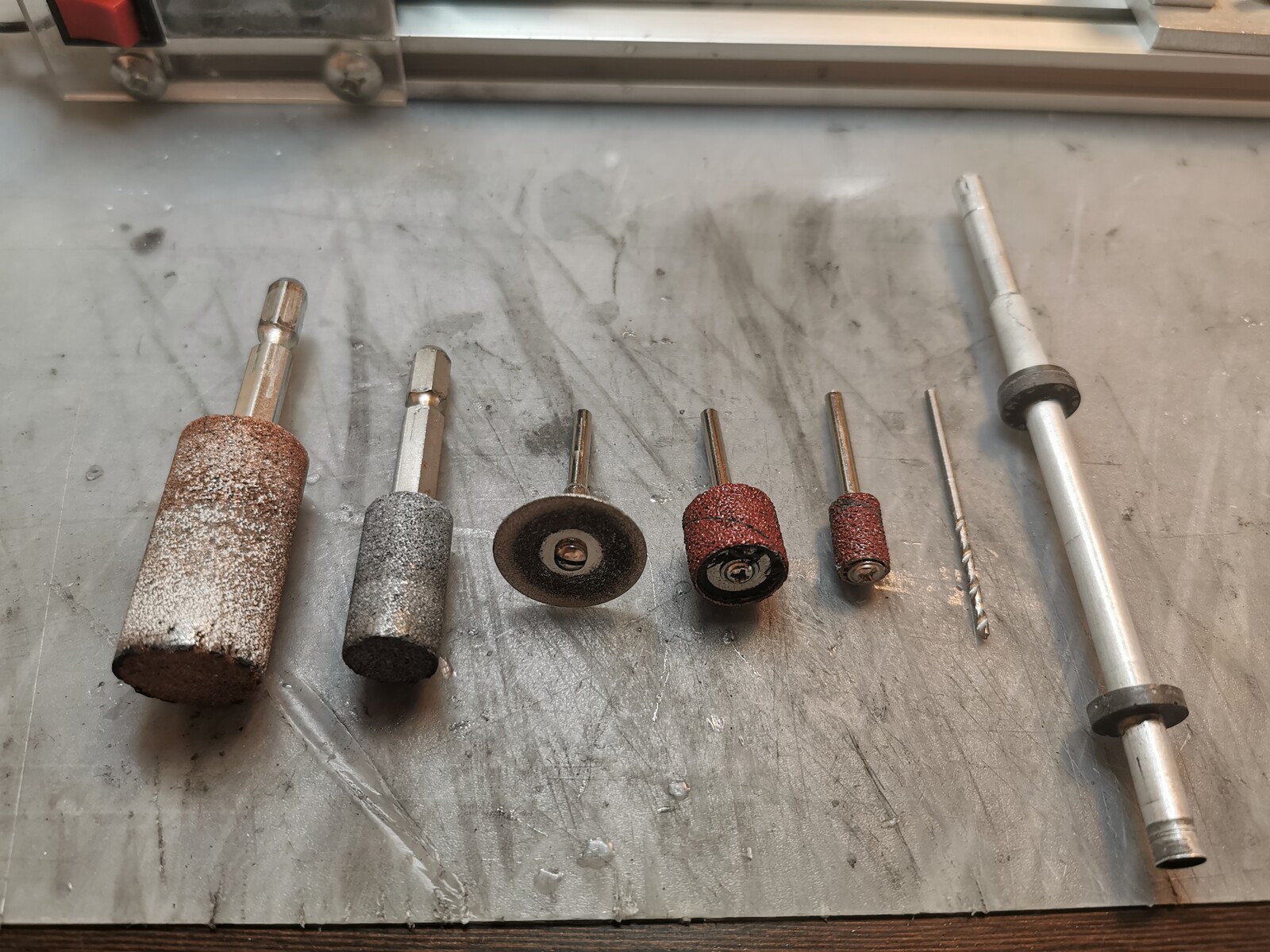 研磨用の砥石、ダイヤモンドカッター、荒削り用のサンディングバンド、ドリルビット、アルミパイプ(アーバーが付いてるヤツ)。