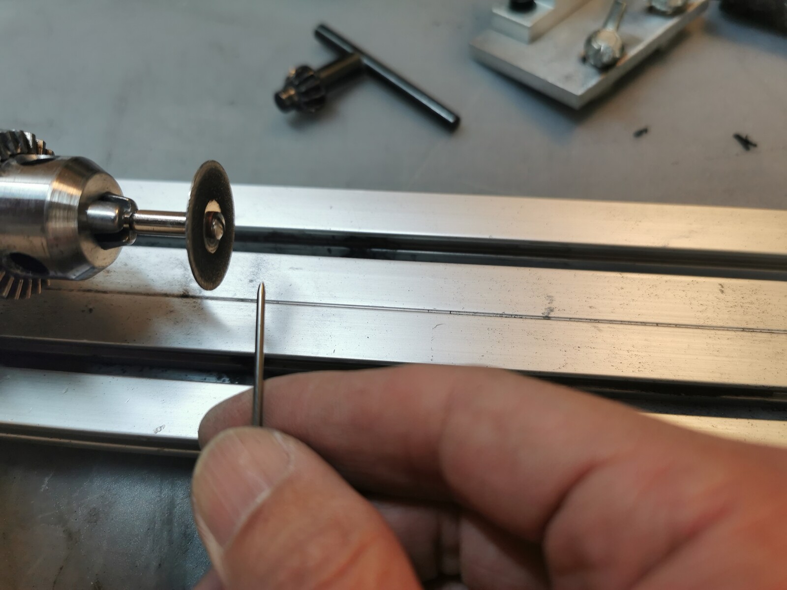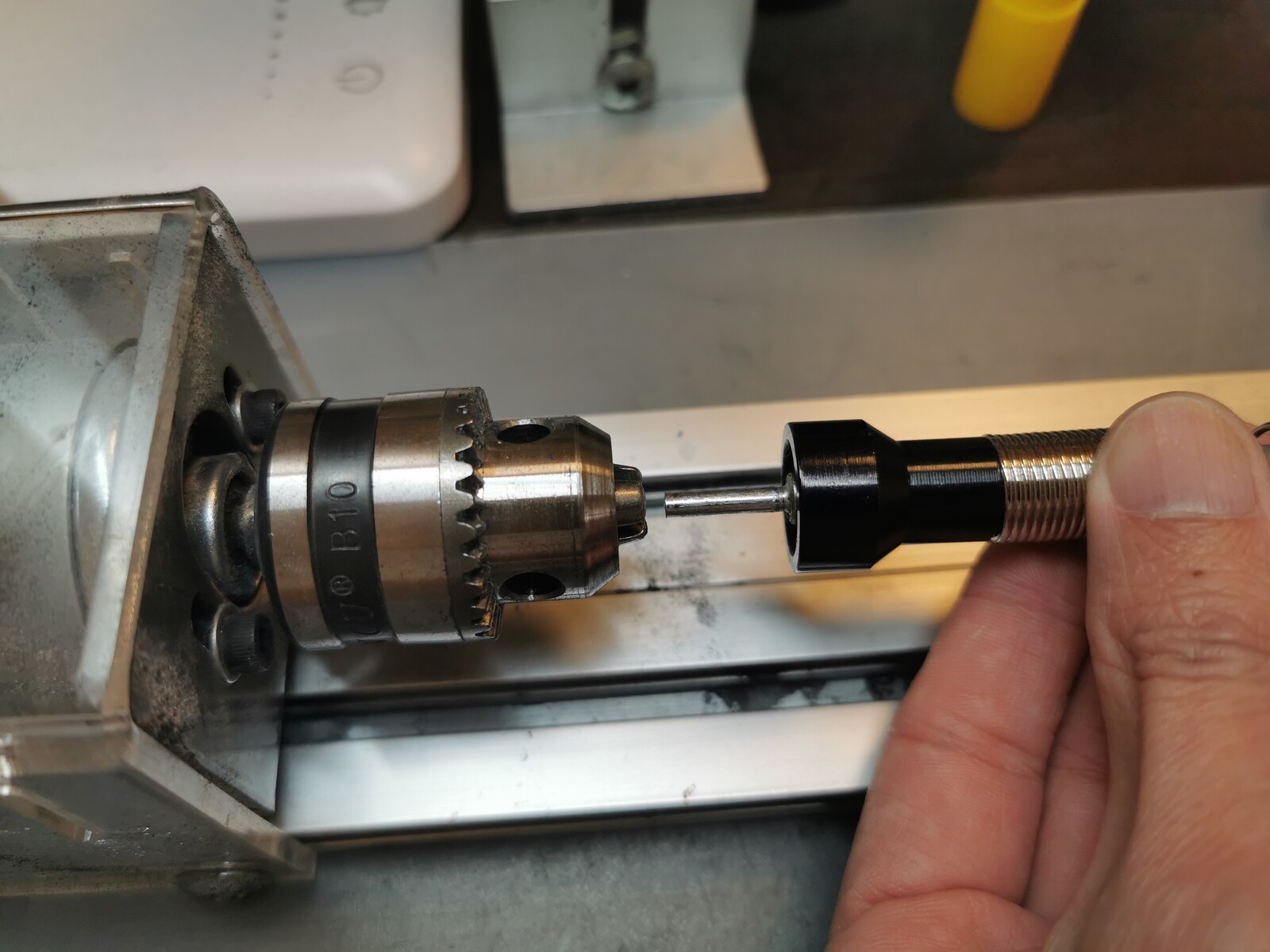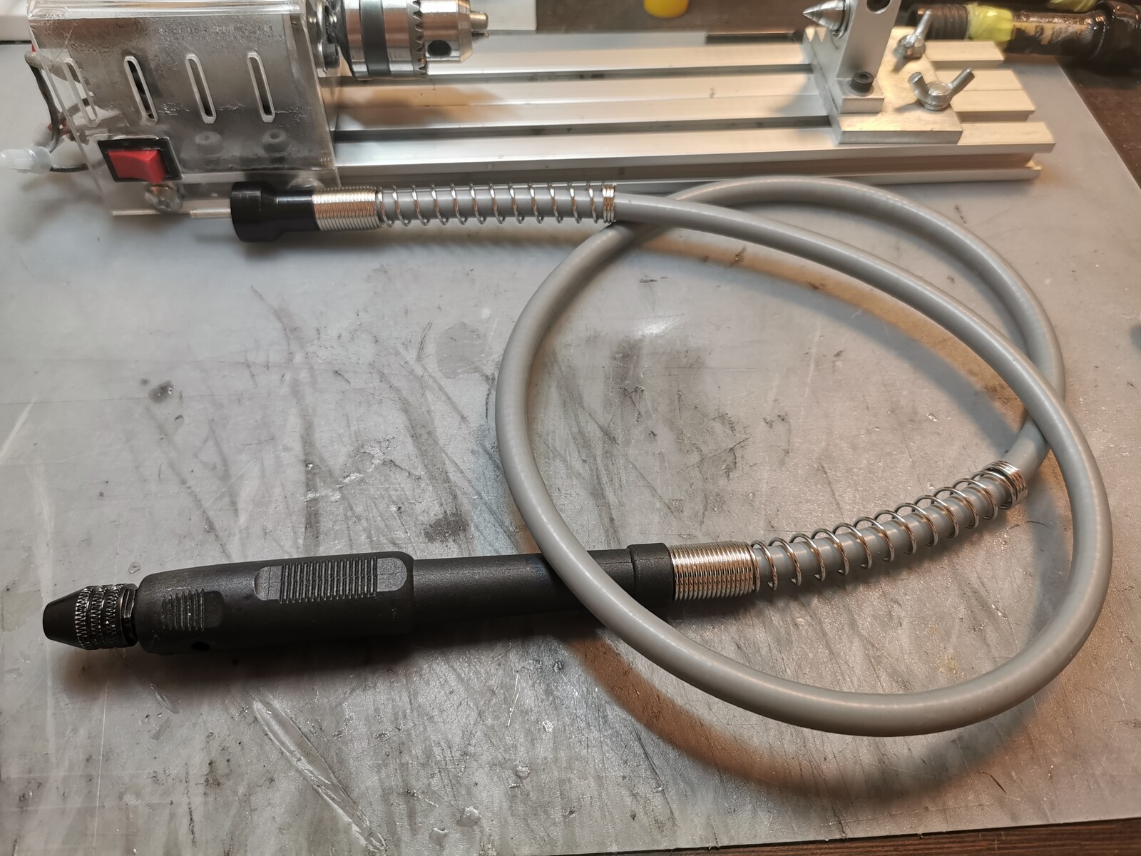 0.6mmから6.0mmまで対応の三爪チャックが付いている小型の旋盤。