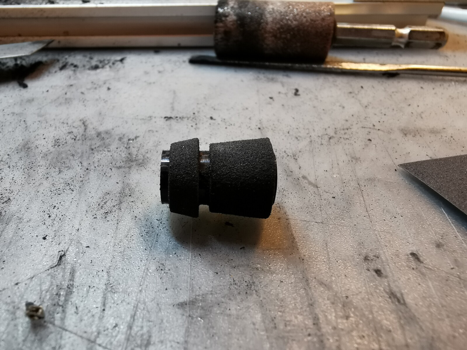 アーバーの外径調整のための研磨は、M6サイズのネジとボルトを使用して、削りたい対象物をボルトで挟んで固定。あとはダイヤモンドヤスリを当てて少しずつ削っていく。