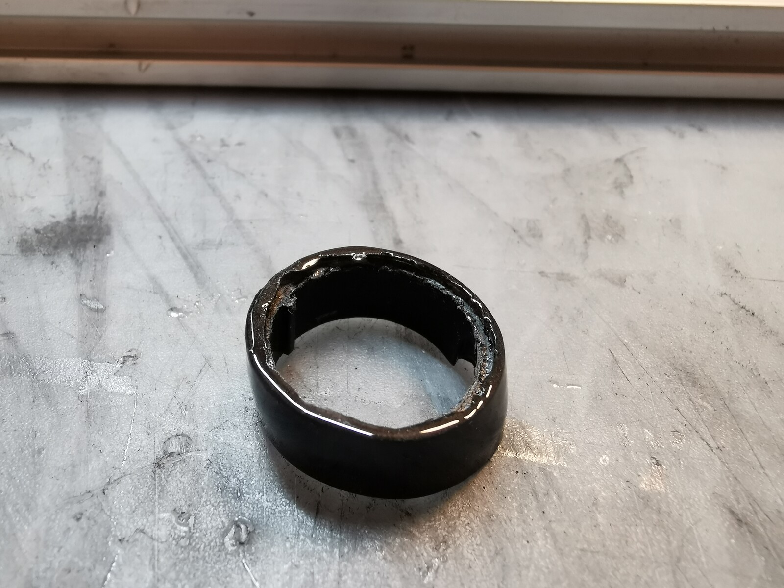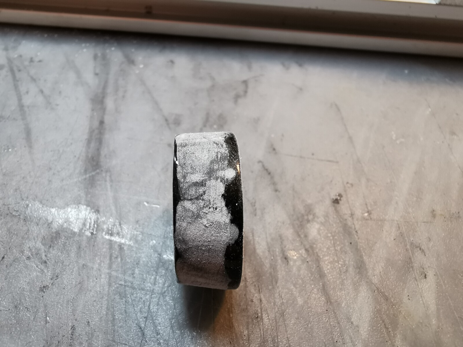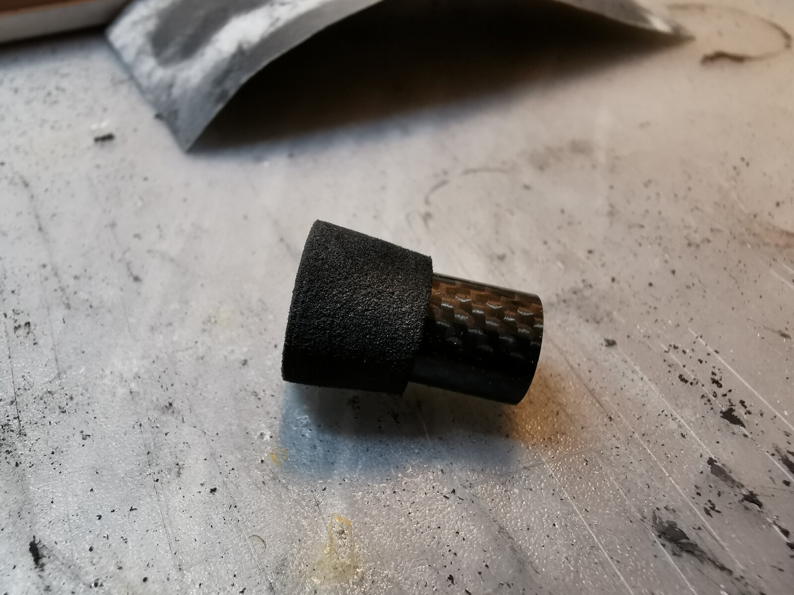 作成中の分離しないカーボンフードだけど、フードスクリュー部とのジョイント部に余計なコーティングが付いて膨らんでいるのを研磨します。