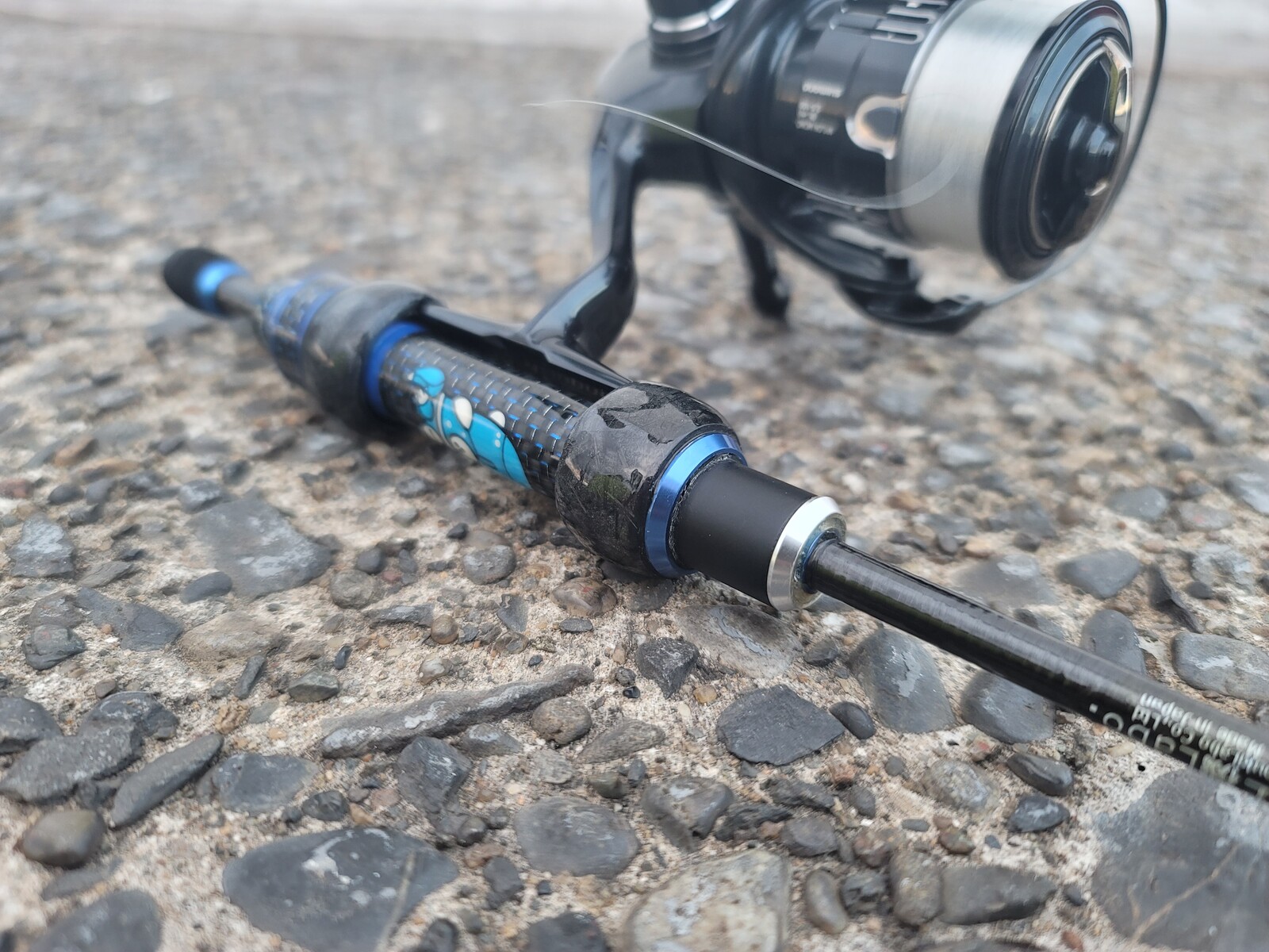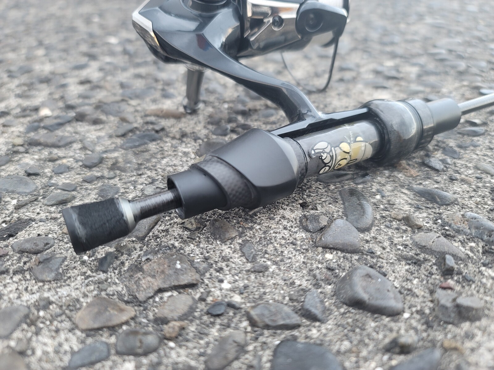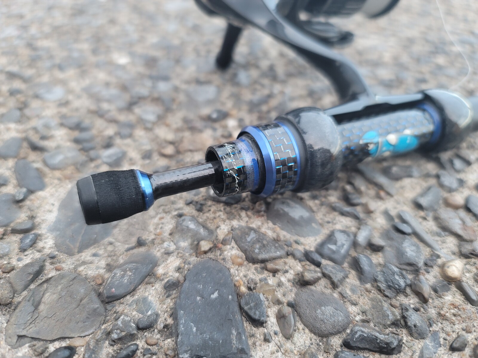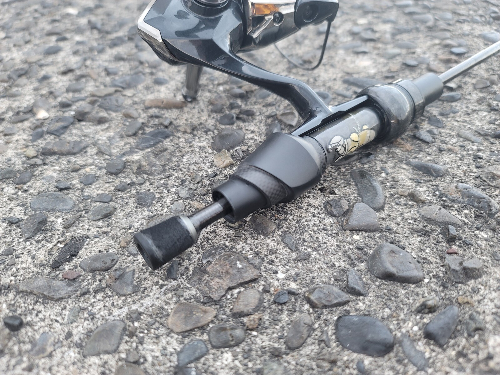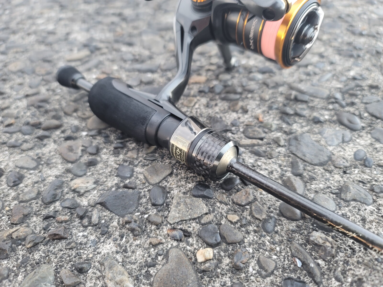 ブラックに統一されたこのロッド、リールシートとブランクの結合部にはカーボンアーバーが艶めかしく輝く。