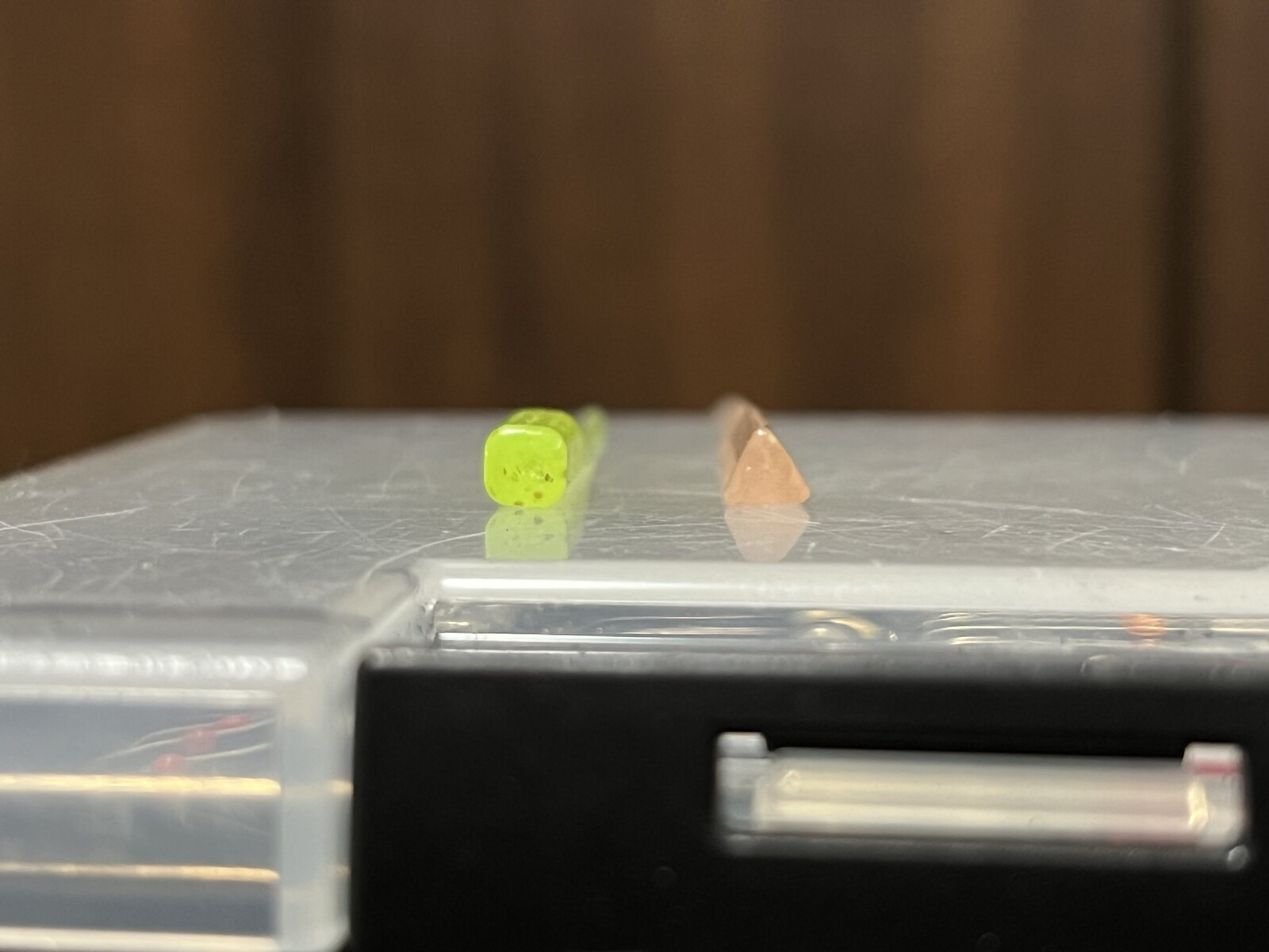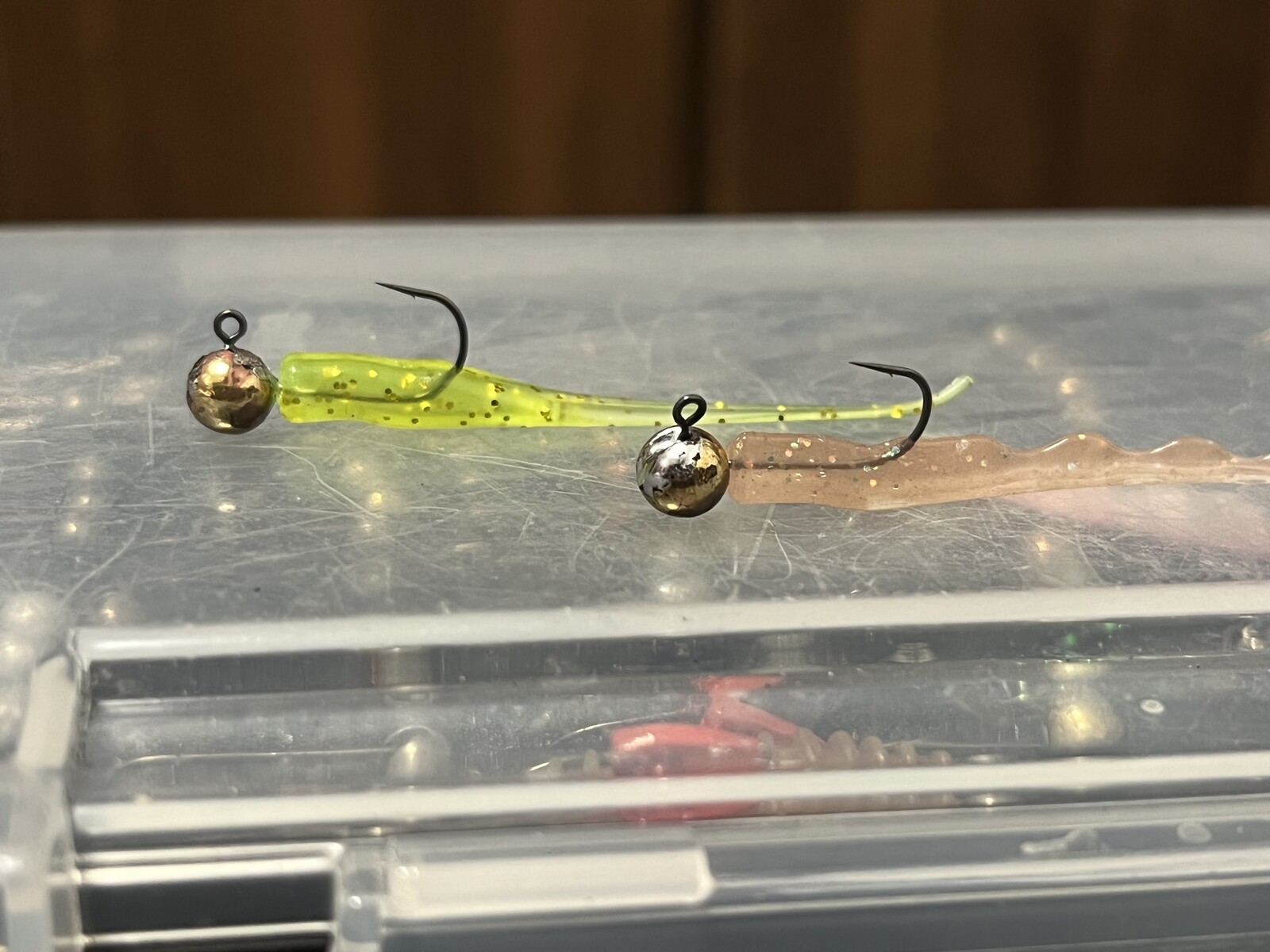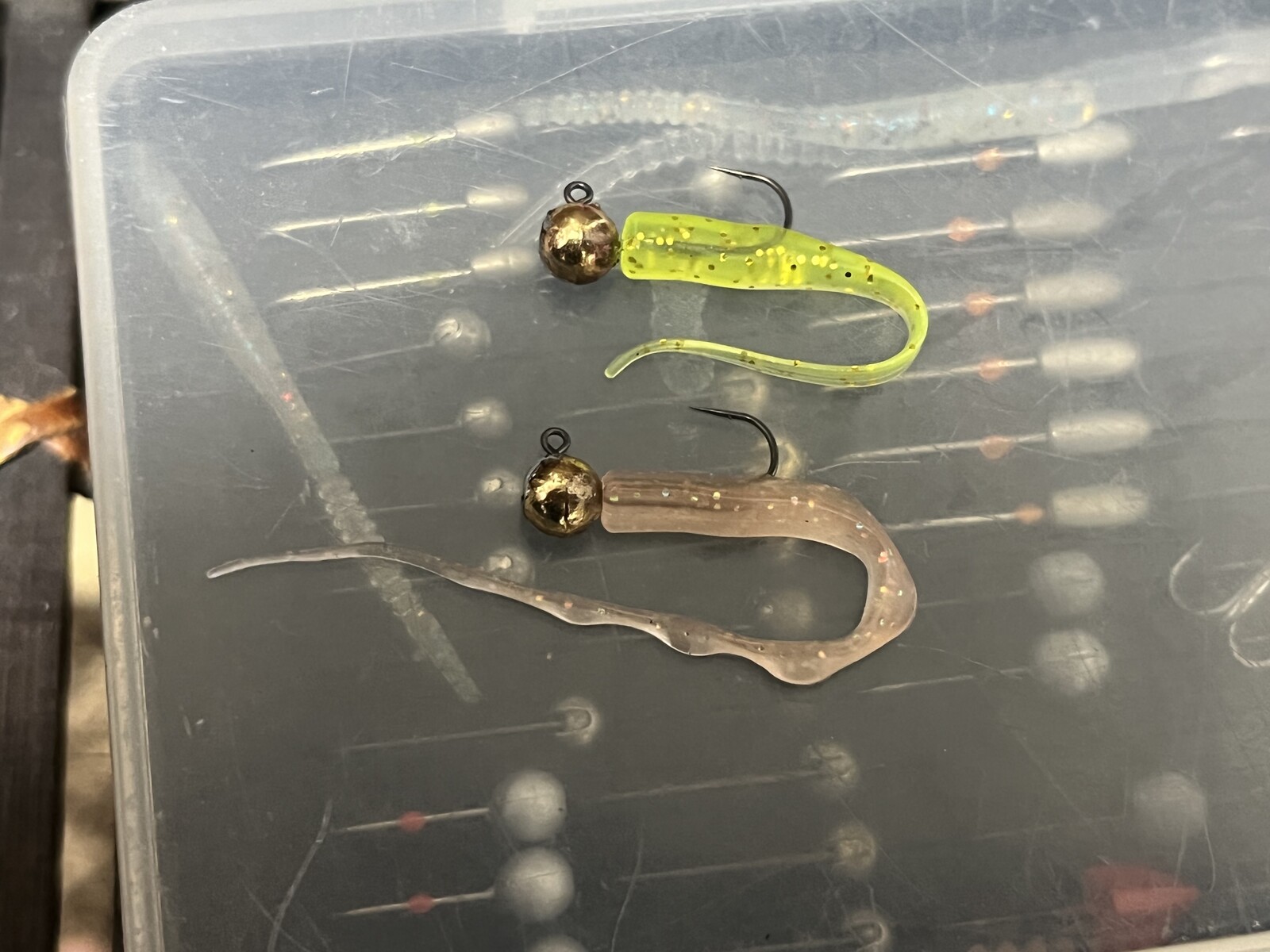 写真の上(黄色っぽいカラー)がラニーノーズII。これは2インチ。下(オキアミカラー)がウェーブテールII。こっちは2.8インチ。