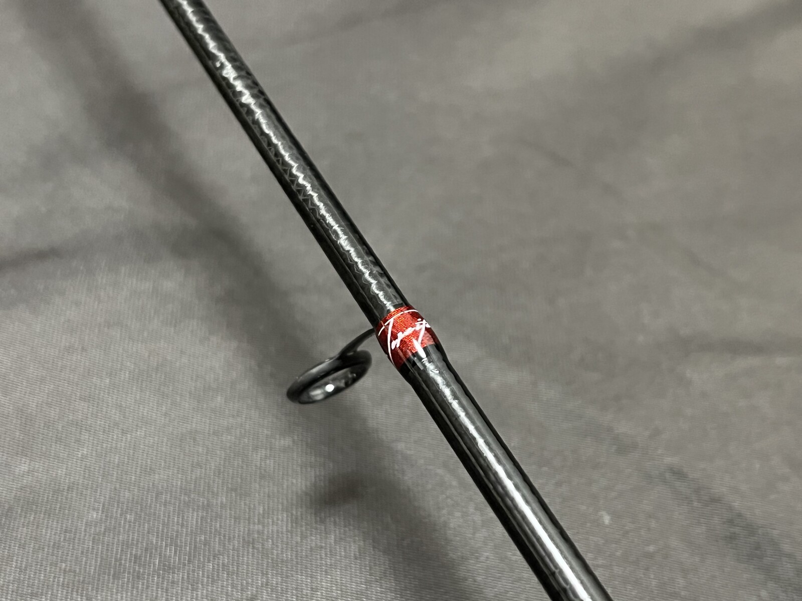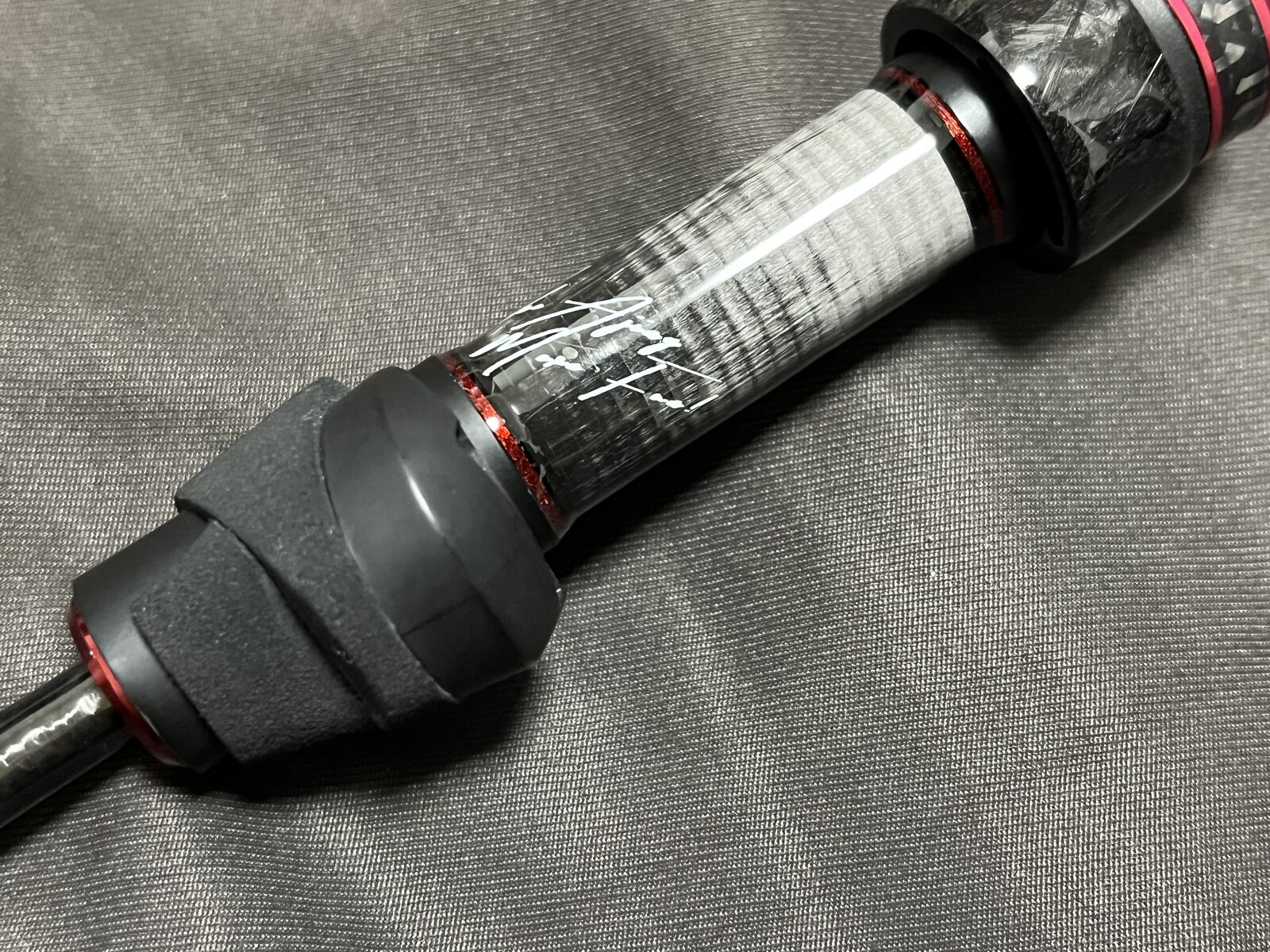 飾り巻きの代わりにカーボンブレードホースを被せ、その上にメタルレッドのスレッドでシングルクロスラッピングをする事により、「和」のイメージを作り出す。